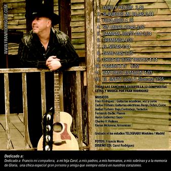 Fran Rodríguez: Cantante y compositor nacido en Madrid, es considerado un auténtico outsider del circuito musical, por su independencia y estilo desenfadado, con influencias tex–mex , country folk y rock sureño., nos trae ahora en solitario su ultimo trabajo en el que destacan canciones folk como "Chica de ojos tristes", western como la increíble "Forajidos", coutrybilly como la autobiográfica "Duro Y Peleon", y temas de rock and roll castizo como "Tremenda" y "Dame mas", y el swing desenfadado de "El Notas", un repaso por todos los estilos que han dejado influencia en sus composiciones un disco personal que no te dejara indiferente.